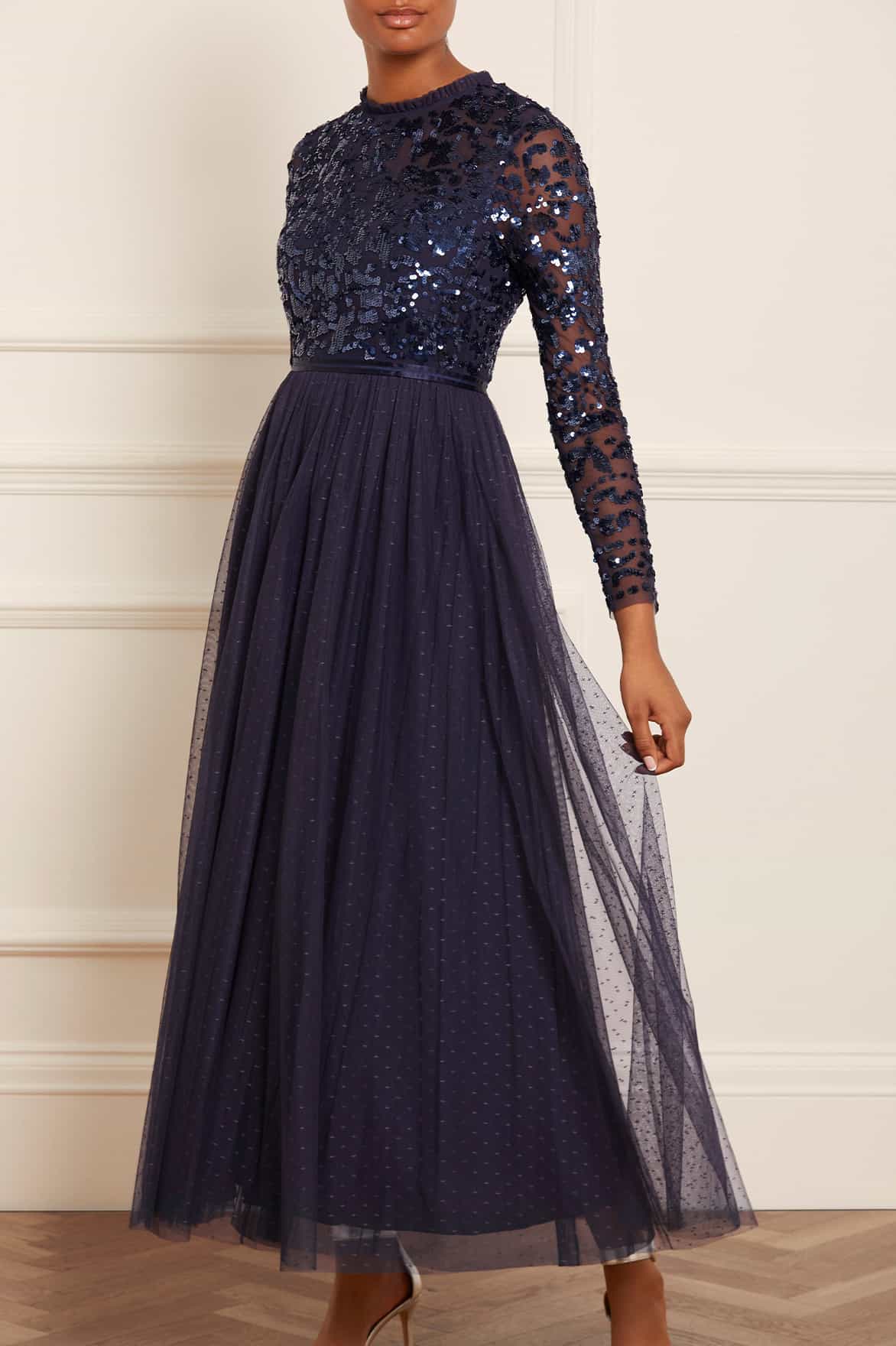 NEEDLE & THREAD EXCLUSIVE. The Tempest Bodice Ankle Gown in Navy. This ankle dress is inspired by a vintage lace tablecloth design, embellished with shimmering sequins all over the bodice. Designed with long sleeves, a layered tulle skirt with an 'x' motif and frill trim detailing around the neck. Make an entrance in the Tempest.