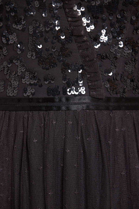 The Tempest V-Neck Bodice Ankle Gown in Graphite. This beautiful gown is inspired by a vintage lace tablecloth design. Its bodice is adorned with sequins, creating an all-over shimmer effect. Crafted with long sleeves, a v-neckline and a tulle multi-layered skirt. Make an entrance in the Tempest.