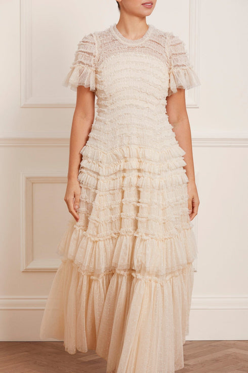 The Valentine Ruffle Gown in Champagne. A signature Needle & Thread style developed with textile ruffles and flattering tulle, creating a romantic look. The ruffles cascade down the dress, starting smaller and gradually getting bigger towards the hem to create soft, fluid movement. Crafted from our signature Needle & Thread kisses tulle. Make a statement in the Valentine.