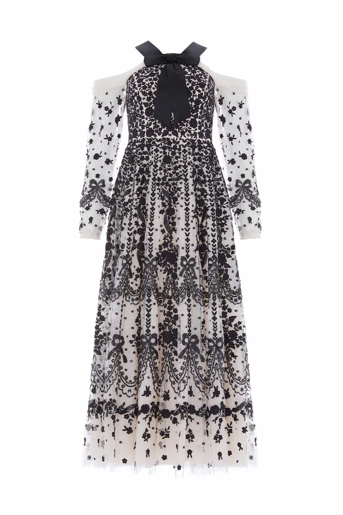 The Adeline Off-Shoulder Ankle Gown in Cream/Graphite. A dramatic take on evening elegance. Delicately embroidered with Victorian-era inspired florals, bows and scallops in contrast graphite thread, this off-shoulder silhouette embraces romance with a contemporary twist. Shimmering sequin embellishments enhance the flattering fitted bodice, while the ankle-length skirt flows into a cascade of softly glinting florals.