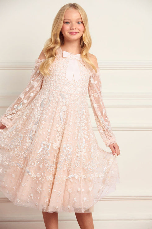 The Adeline Off-Shoulder Kids Dress in Opal/Cream. A soft, elegant piece with signature Needle & Thread charm. Victorian-inspired floral motifs and scalloped embroidery brings whimsical detail to the layered tulle. Perfectly pairs with the women’s Adeline Gown in the same colourway for matching occasionwear.