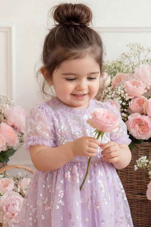 NEW SEASON. The Confetti Baby Dress in Lilac Pearl/Multi. A playful design adorned with soft floral sequins across airy tulle. With flutter sleeves and a gently gathered skirt, it’s designed for comfort and sparkle at special celebrations.