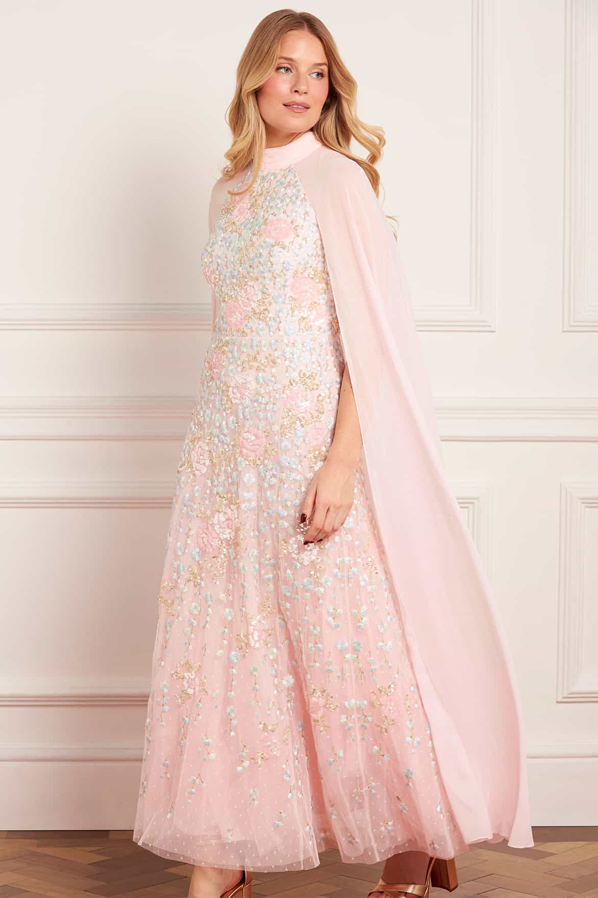 NEW SEASON. The Cressida Floral Cape Ankle Gown in Seashell/Multi. Features exquisite embroidered blooms and a delicate chiffon cape. Designed with raglan seams and soft movement through the skirt, this gown evokes ethereal romance and graceful sophistication.