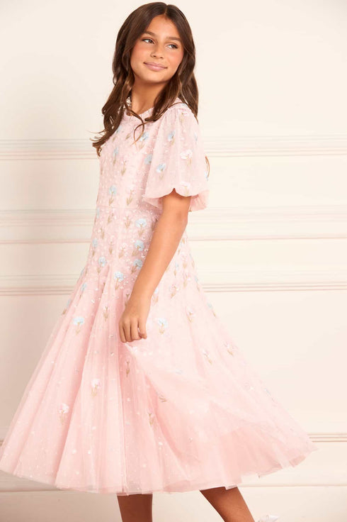 NEW SEASON. The Dandelion Ditsy Kids Dress in Seashell. Sparkles softly with intricate floral embroidery. Designed with a light tulle skirt and delicate ruffles, it’s made for magical, carefree moments. This piece matches the Dandelion Ditsy Ankle Gown from the womenswear line for a timeless coordinated style.