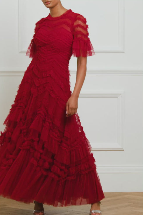 The Elia Short Sleeve Gown in Red. This statement signature Needle & Thread textile style is created in-house in our atelier for a perfectly proportioned frill layout. The soft zigzag design is made of tulle ruffles that gradually increase in size towards the hem. Crafted with romantic, frothy sleeves using delicate tulle adorned with frills and ruffles at the cuff. The skirt is composed of generous layers of net and tulle with a sweeping hemline. A go-to piece you'll forever treasure.