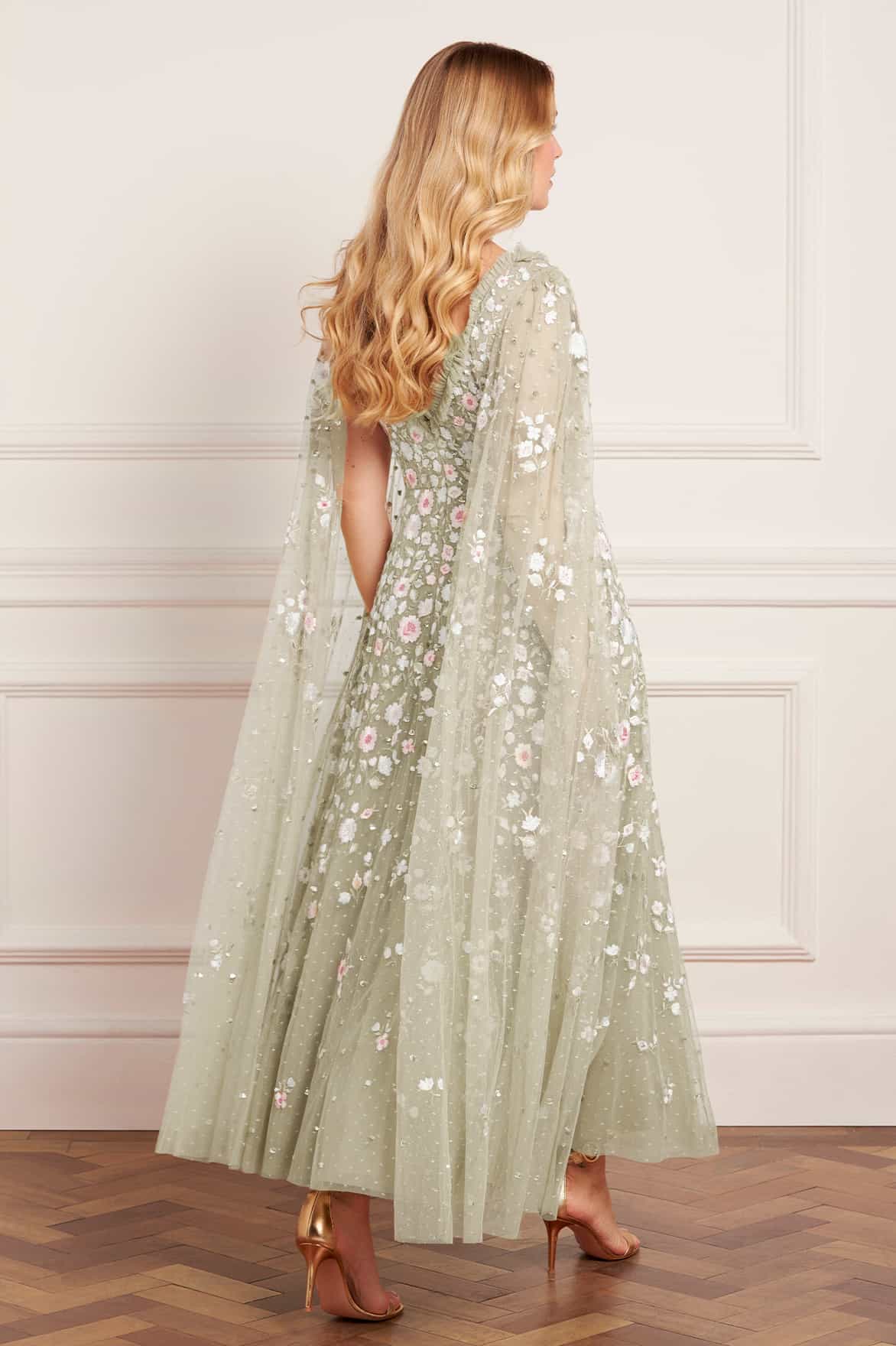 NEW SEASON. The Ethereal Blooms Cape Sleeve Ankle Gown in Aloe/Multi. Features delicate floral embroidery inspired by vintage archive prints. Crafted from flowing tulle, the gown is designed with soft cape sleeves and a romantic A-line skirt, creating a light, graceful finish.