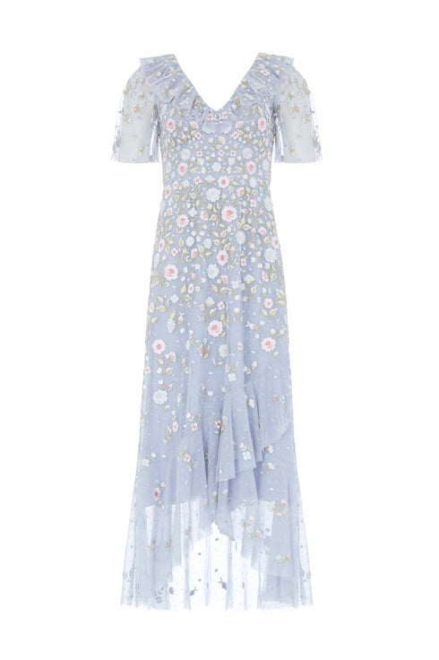 NEW SEASON. The Ethereal Blooms Frill Ankle Gown in Skylight/Multi. A romantic tulle design featuring exquisite floral embroidery interspersed with subtle sequin motifs. Finished with delicate frill detailing and soft pastel tones, this gown exudes lightness and refined grace.