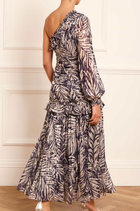 The Feather Lurex One-Shoulder Ankle Gown in Midnight/Beige. This ankle gown features a gold feather lurex print inspired by costumes worn by the Follie’s dancers of the early 1900s. The feather print is hand-painted in-house creating a subtle watercolour effect. This playful one-shoulder dress boasts a flattering gathered ruche detail engineered across the body and adorned with signature Needle & Thread frill detailing. Designed with a blouson sleeve featuring a ruffle cuff and romantic frills. The slim silhouette includes a dropped waist seam with a flirty frill tier. The stretch lining fabric ensures fit and comfort.