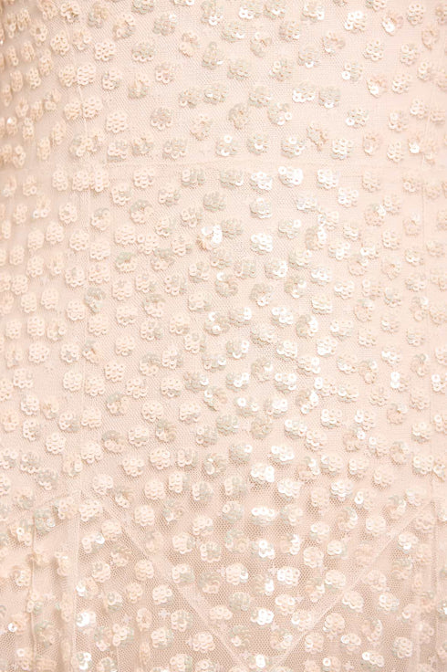 The Leila Dot Sheer Ankle Gown in Cream. This gown features shimmering dot motifs that create a glittering effect, with sequins coated for a lustrous, high-shine finish. Designed as a sheer statement dress, it includes an integrated stretch bodysuit for comfort. Crafted with slim sleeves and a round neckline, adorned with signature Needle & Thread tulle frills, complete the look. The ultimate piece for an upcoming special occasion.