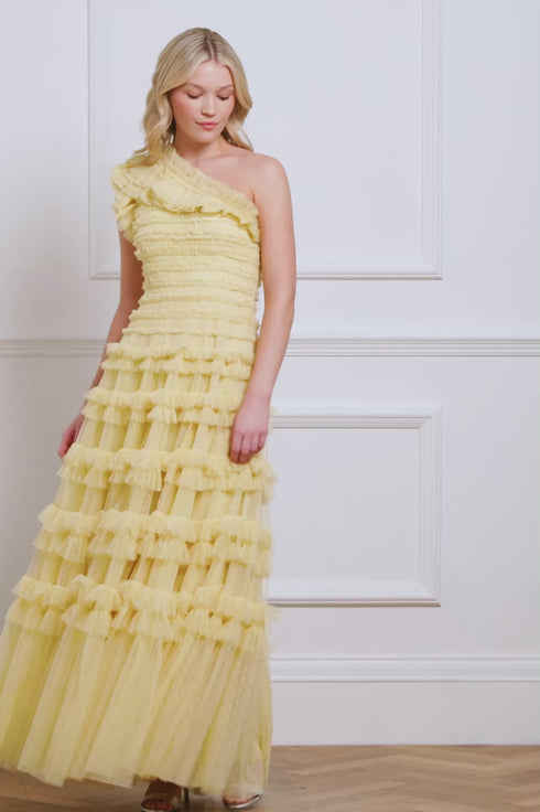 The Lisette Ruffle One-Shoulder Gown in Daffodil combines elegance and romance. Featuring a one-shoulder silhouette and soft tulle ruffles, it showcases Needle & Thread’s signature style with frills that graduate in size towards the hem. The skirt, crafted from layers of net and tulle, flows into a sweeping hemline, ensuring all eyes are on you.