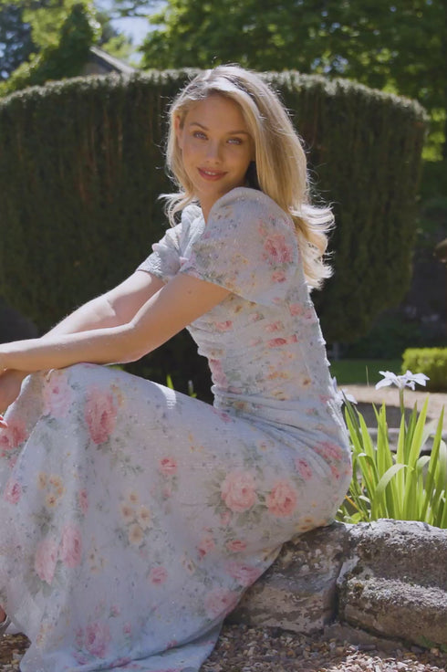 The Pompadour Garden Sequin Gown in French Blue. Inspired by the opulent wall coverings of the Palace of Versailles, this gown features luxurious hand-painted floral bouquets and trailing ditsy motifs. Crafted with tiny clear sequins delicately applied for a transparent, shimmering effect. The slim silhouette is beautifully draped, flattering the body, while the fluid, sweeping skirt adds movement. Short sleeves complete the refined, elegant look, making this gown a true statement of luxury and craftsmanship.