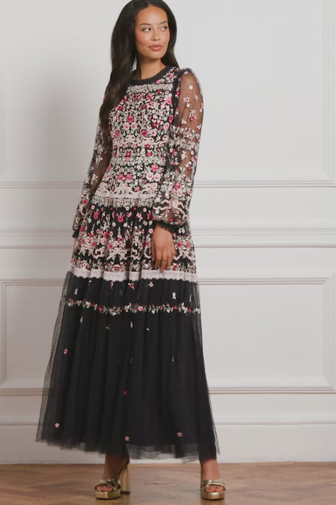 NEEDLE & THREAD EXCLUSIVE. The Ribbon Bouquet Gown in Graphite. This gown is intricately designed with embroidered bouquets of flowers in rich tones, inspired by a 1930s vintage print. Beautifully adorned with delicate lace trims for signature Needle & Thread detailing. The skirt is developed with layers of tulle to create a romantic silhouette. The perfect gown for an upcoming occasion.