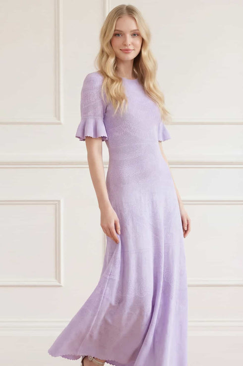 NEW SEASON. The Scallop Lace Pointelle Knit Gown in Powder Lilac. Inspired by classic lace designs, this pointelle knit gown features intricate scalloped detailing throughout. The softly fitted silhouette creates a refined yet comfortable option for occasion dressing.