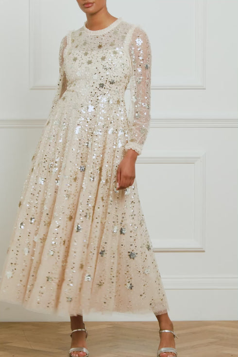 The Shooting Stars Long Sleeve Ankle Gown in Dust Beige/Silver. Beautifully adorned with shimmering embellishments of intricate star motifs, with clusters of tiny sparkling sequins that scatter towards the hem, create a captivating effect. Inspired by the extravagant costumes worn by the Follie’s dancers of the early 1900s, this romantic gown features blouson sleeves adorned with glittering celestial motifs in countless tiny sequins, complemented by signature Needle & Thread tulle frills. The skirt boasts generous layers of net and tulle, culminating in a sweeping hemline. This gown captures the magic of fairytales and the beauty of the night sky.