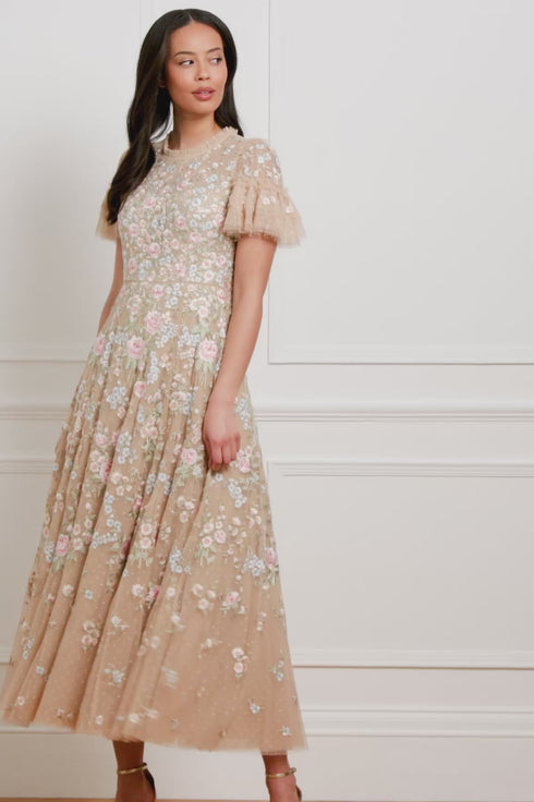 The Antoinettes Floral Round Neck Ankle Gown in Butterscotch. A nod to the lavish beauty of Versailles, the Antoinette Gown showcases exquisite multicoloured floral embroidery, cascading in delicate clusters toward the hem. The round neckline is framed by signature Needle & Thread tulle ruffles, while short sleeves are finished with softly gathered tulle frills for a whimsical touch. Crafted with generous layers of net and tulle, the ankle-length skirt flows into a graceful, sweeping hemline—bringing timeless romance to any occasion.