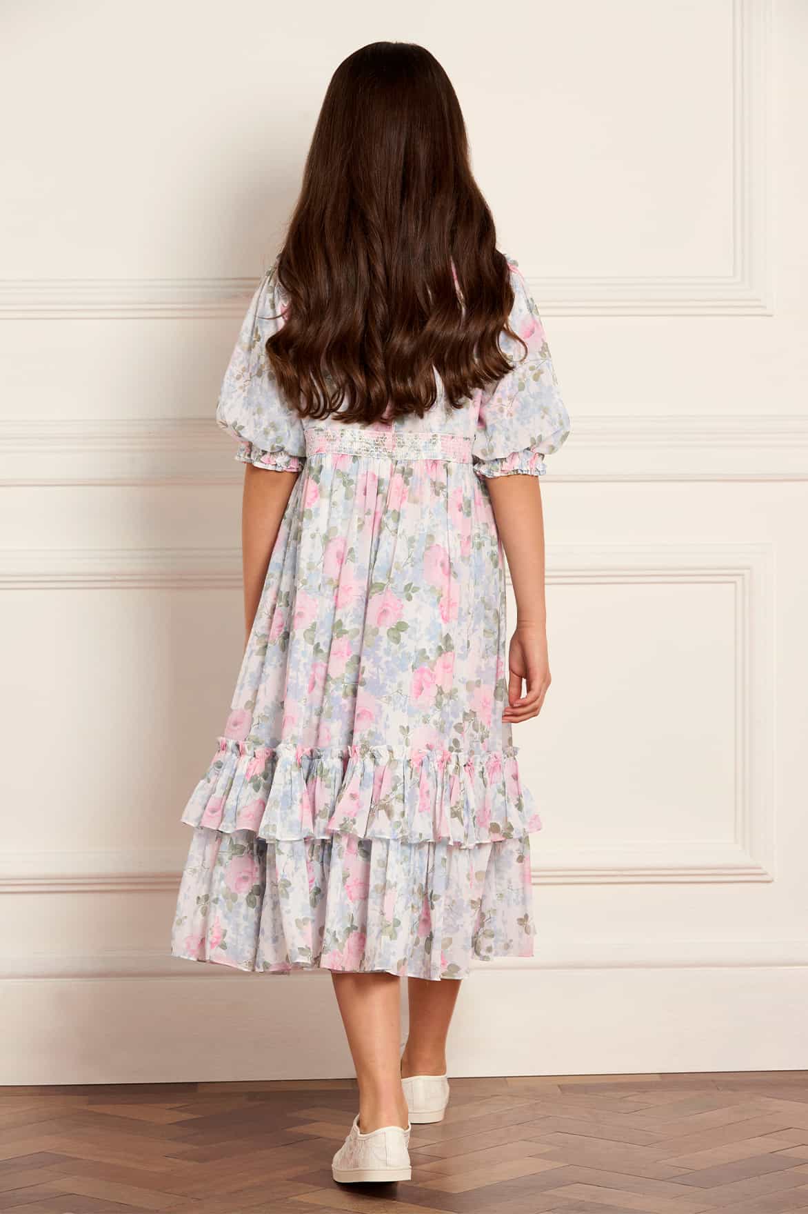 NEW SEASON. The Camille’s Garden Chiffon Smocked Kids Dress in Moonshine. Showcases hand-painted floral artwork in delicate pastel hues. With flutter sleeves and a comfortable smocked bodice, this style complements the Camille’s Garden Chiffon Halter-Neck Gown from the womenswear line for a matching mother–daughter look.