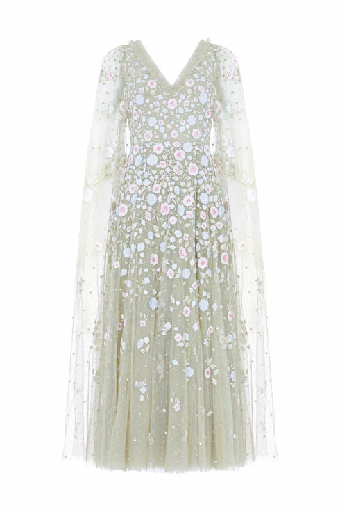 NEW SEASON. The Ethereal Blooms Cape Sleeve Ankle Gown in Aloe/Multi. Features delicate floral embroidery inspired by vintage archive prints. Crafted from flowing tulle, the gown is designed with soft cape sleeves and a romantic A-line skirt, creating a light, graceful finish.