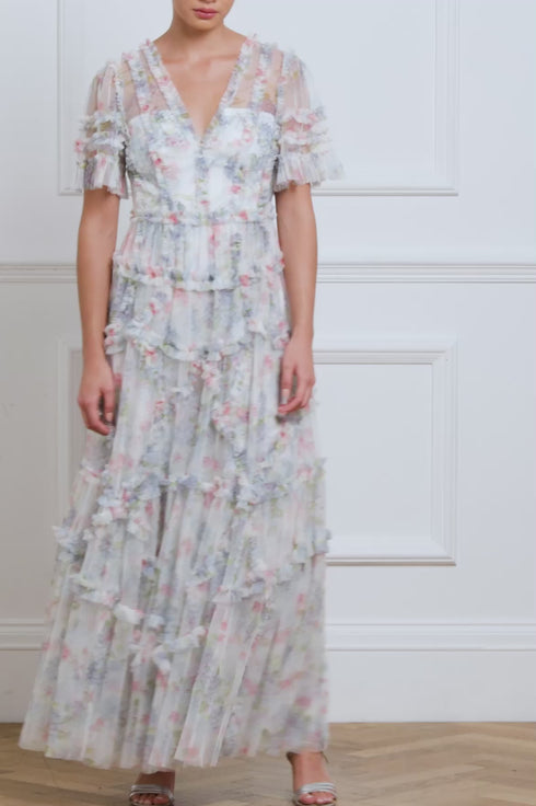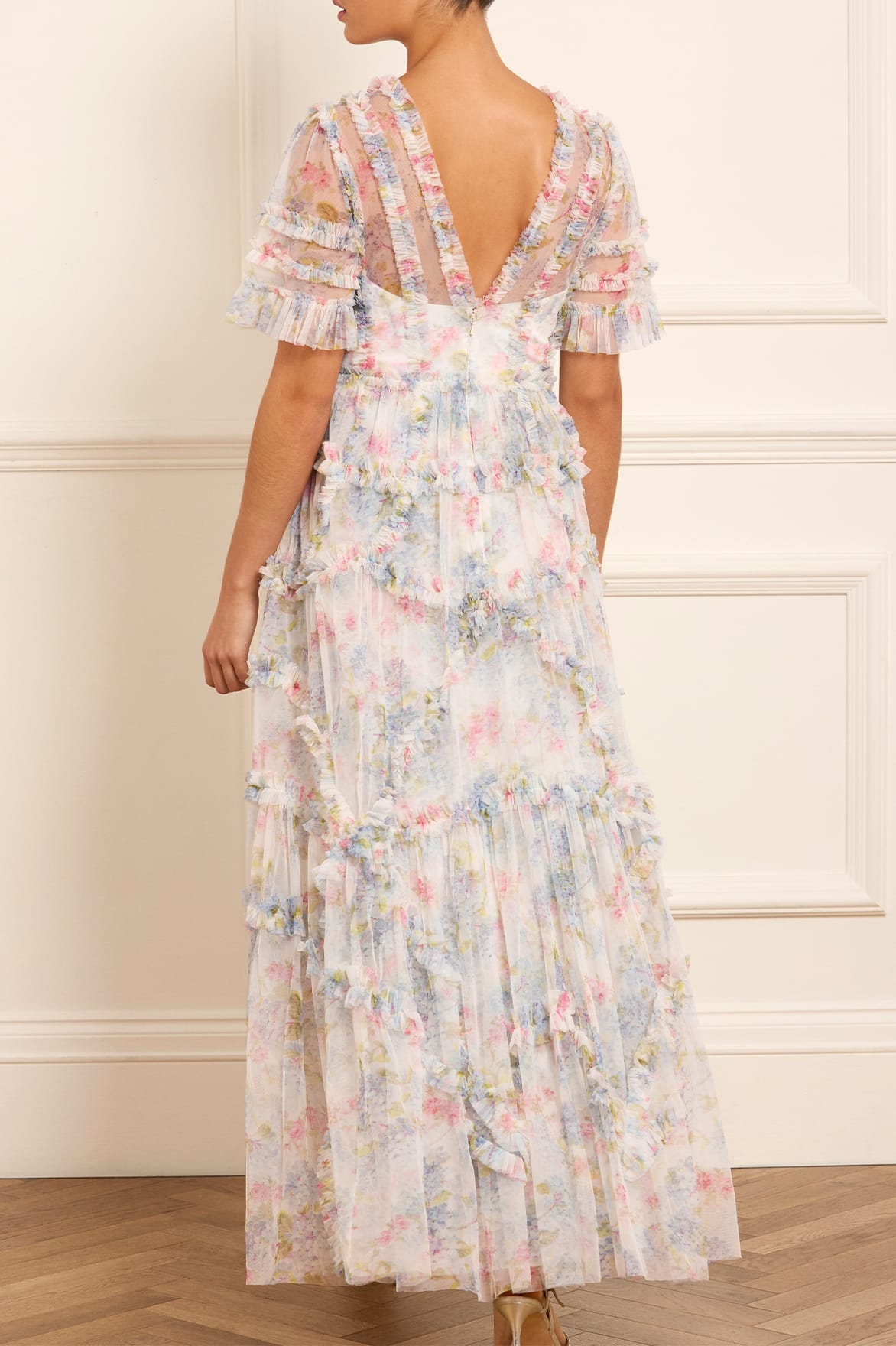 The Hydrangea Ruffle Gown in Moonshine. An exquisite statement print taken from the archive, this hand-painted artwork from the early 1900s depicts blooms of hydrangea flowers and smaller trailing florals, all rendered with a soft watercolour feel. This gown is crafted with signature Needle & Thread styling featuring tulle ruffles and layers of delicate tulle, creating pretty, effortless movement. A wardrobe treasure you'll forever hold onto.