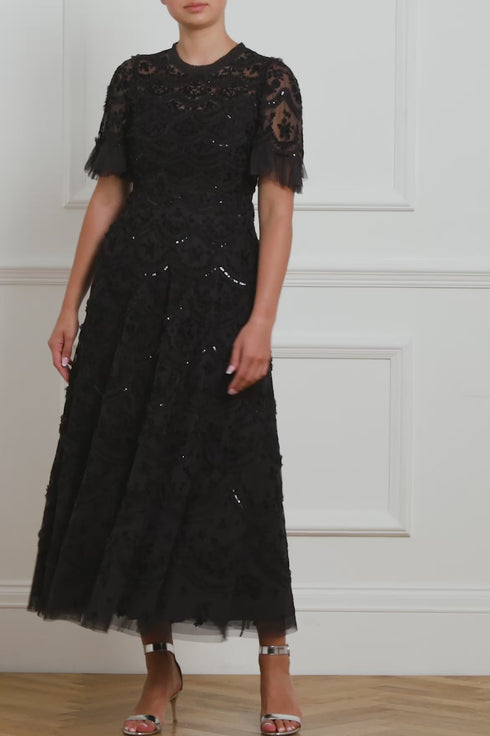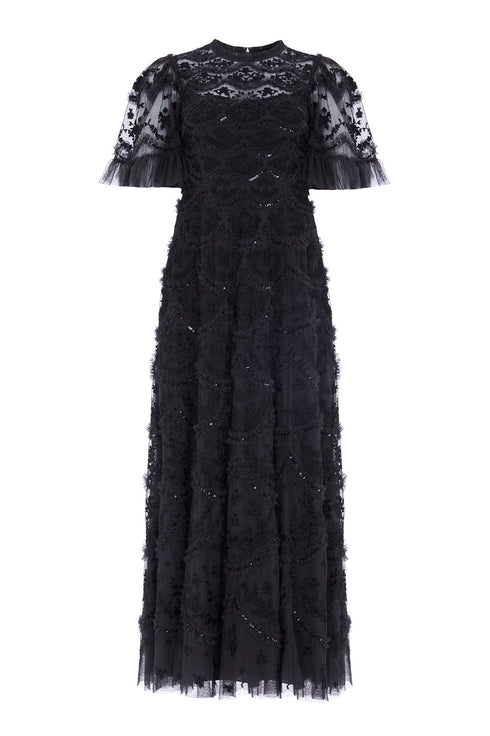 The Lily Bloom Ankle Gown in Graphite. This ankle gown is beautifully designed with delicate tulle ruffles and soft scallop shaping for signature Needle & Thread styling. Adorned with intricate white floral embroidery and trimmed with a high shine sequin adding shimmer throughout. Make the Lily your new wardrobe addition.