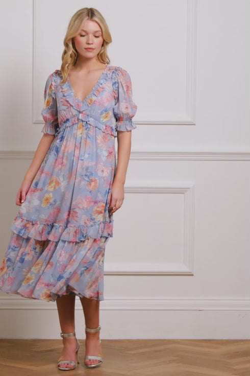 The Mariannes Floral Chiffon Short Sleeve Ballerina Dress in Sky Blue, inspired by Victorian botanical artist Marianne North. This dress features a vibrant floral print with bold, painterly brushstrokes. Made from soft semi-sheer chiffon, this easy-fit dress is fully lined for comfort. Designed with signature Needle & Thread ruffles adorn the neckline, shoulders, and bust seam, while the gathered skirt hem is finished with a topstitched frill. Developed with blouson sleeves with delicate frills and elasticated cuffs add an elegant touch. The perfect dress to pack for your holiday.