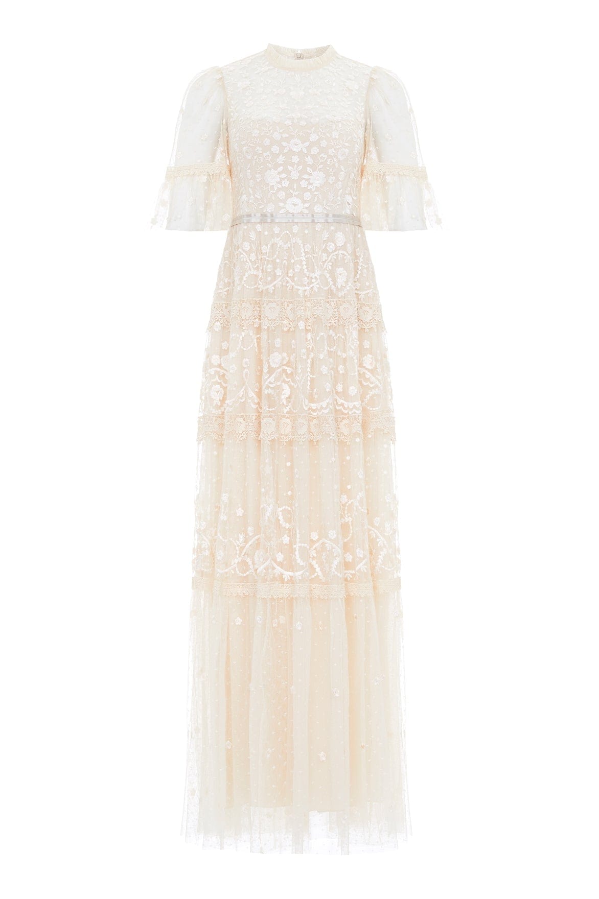 The Midsummer Lace Round Neck Gown in Champagne. A signature Needle & Thread style, with an updated neckline for the Taking inspiration from Victorian lace, the Midsummer features intricately embroidered artwork in tonal colours on delicate tulle. Beautifully developed with lace frills framing each tier of the skirt. This embroidered lace gown has sheer, romantic sleeves and our signature grosgrain ribbon at the waist. The perfect gown to take you from day to night.