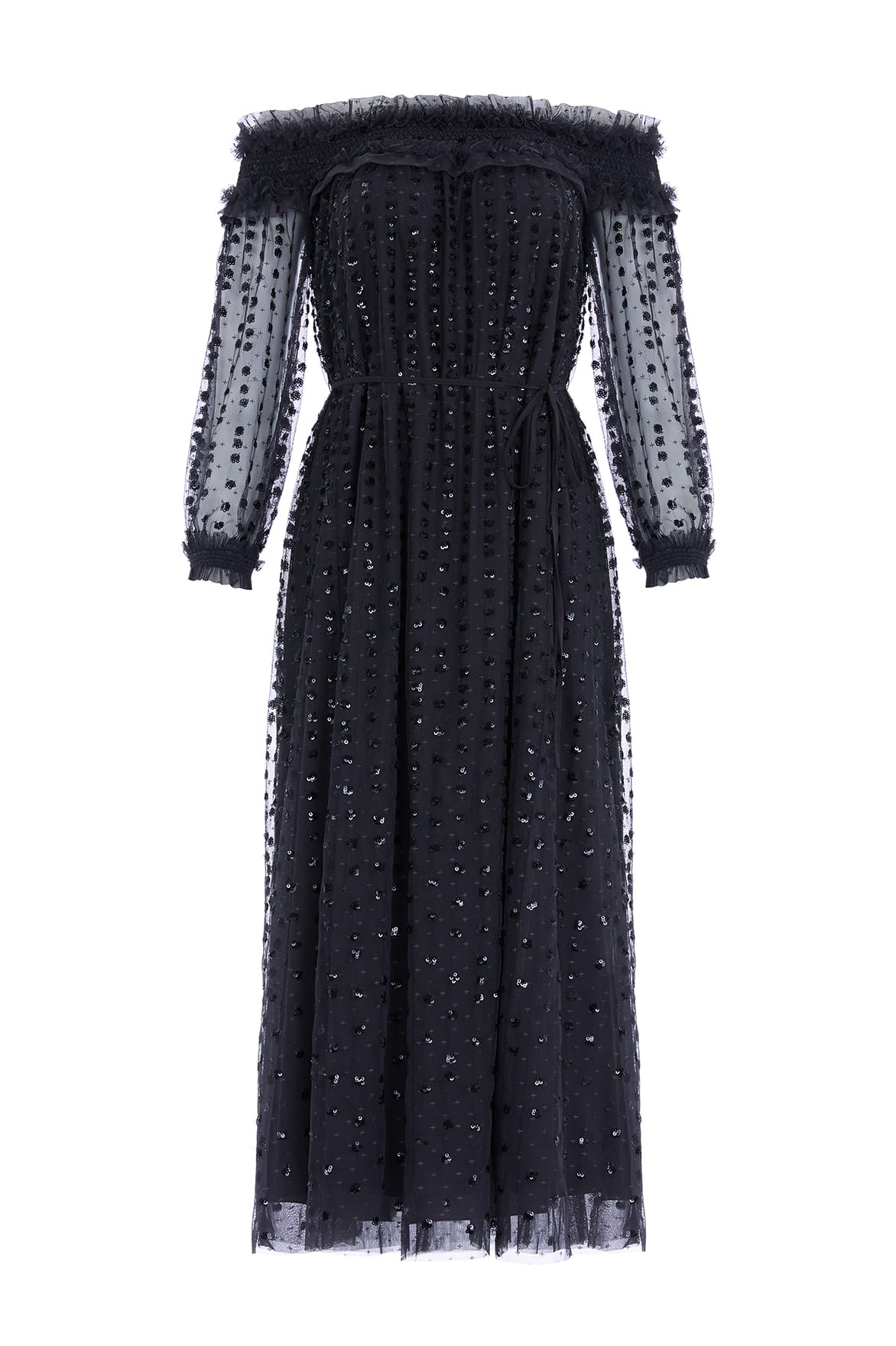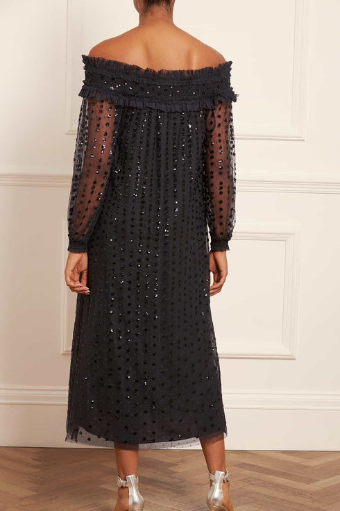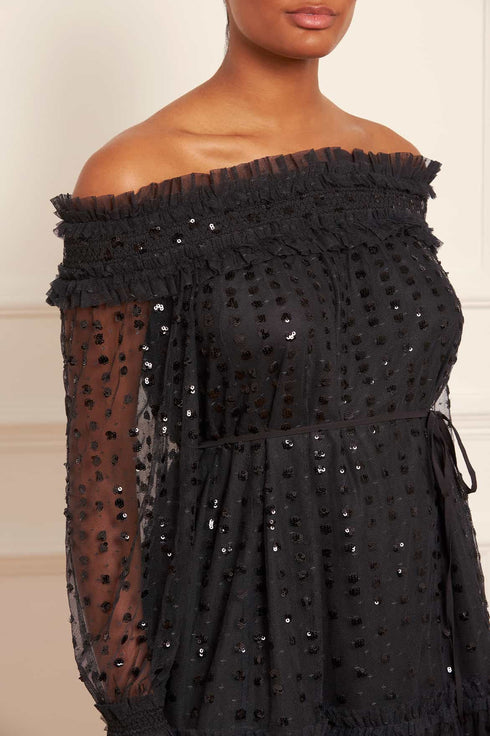 The Raindrop Smocked Gloss Off-Shoulder Ballerina Dress in Graphite. Beautifully decorated with shimmering sequins dispersing down the body. This ballerina dress is developed with an off-the-shoulder design with signature Needle & Thread frills for an elegant look. This romantic style is crafted with a loose-fit, whimsical silhouette featuring a delicate fabric belt for versatile styling. A piece you'll forever treasure.