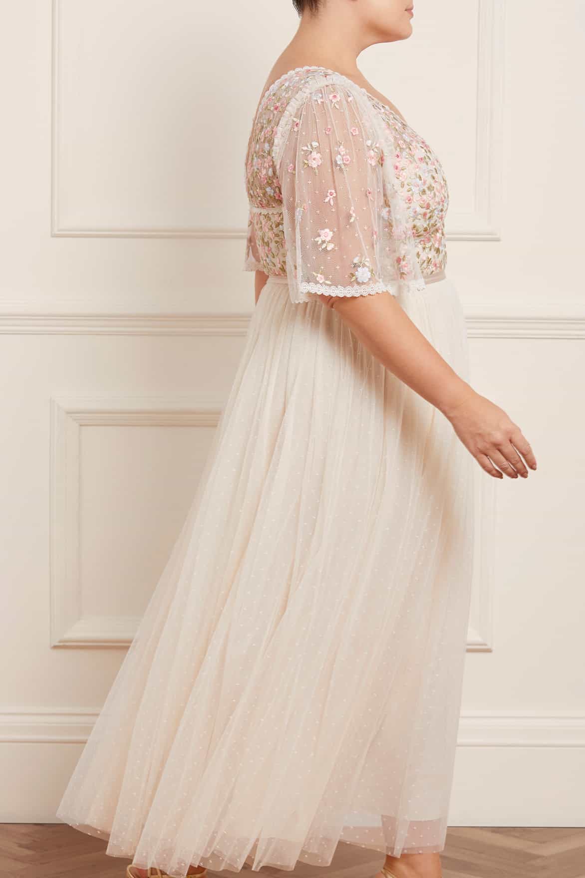 The Ribbon Bouquet Bodice Ankle Gown in Champagne / Pink Multi. The bodice of this gown is intricately designed with embroidered bouquets of flowers in rich tones, inspired by a 1930s vintage print. Beautifully adorned with delicate lace trims for signature Needle & Thread detailing. The skirt features layers of tulle to create a romantic silhouette. The perfect gown for an upcoming occasion.
