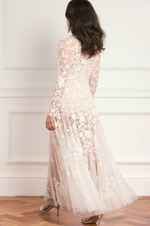NEW SEASON | NEEDLE & THREAD EXCLUSIVE. The Rosa Sheer Ankle Gown in Swan White. An ethereal ankle-length gown featuring delicate Rosa embroidery layered over a sheer silhouette. Designed to move beautifully, this style offers a romantic, light-as-air finish for special occasions.