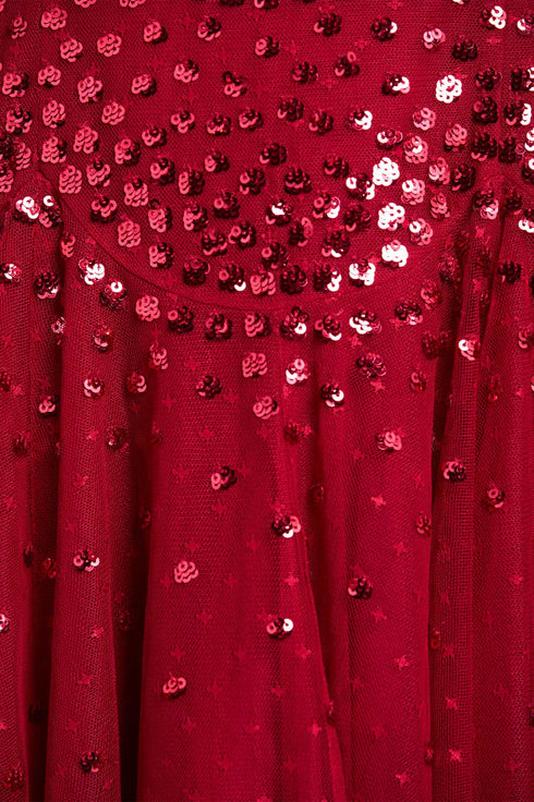 NEW SEASON. Scallop Sequin Round Neck Micro Mini Dress in Red. A playful interpretation of Needle & Thread’s signature scallop embellishment. Sequins are arranged into decorative scallop bands across a fitted bodice and mini skirt, shimmering with every movement. The round neckline and slim silhouette balance bold sparkle with refined shape, while the red hue intensifies its drama.