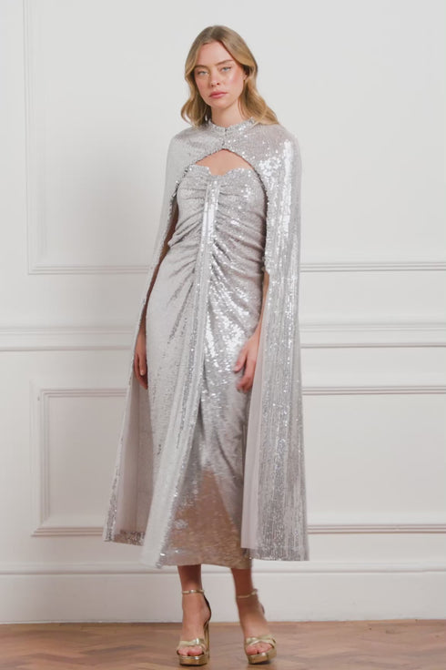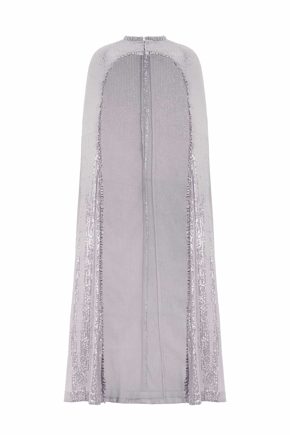 NEW SEASON. Amora Long Cape in Dove/Silver. A celestial-inspired layer designed to elevate evening dressing. Crafted in delicate tulle, the cape is embellished with shimmering sequins in silver tones, creating a starry sky effect that sparkles with movement. The dove-grey base softens the metallic embellishment, adding refinement and romance. A statement piece that transforms any gown, perfect for dramatic entrances and ethereal styling.