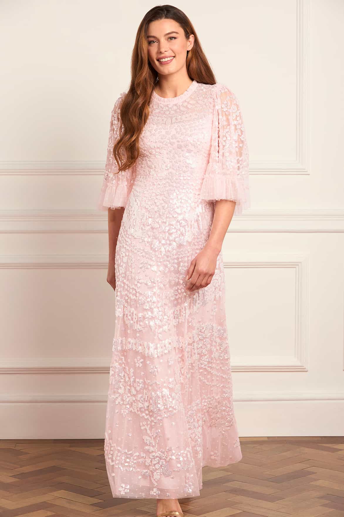 NEW SEASON. The Anais Sequin Gown in Seashell. Adorned with intricate sequin artwork inspired by early 1900s French lace. Designed with a soft fitted bodice and a flowing tulle skirt, this seashell-toned gown shimmers delicately, perfect for romantic evening occasions.