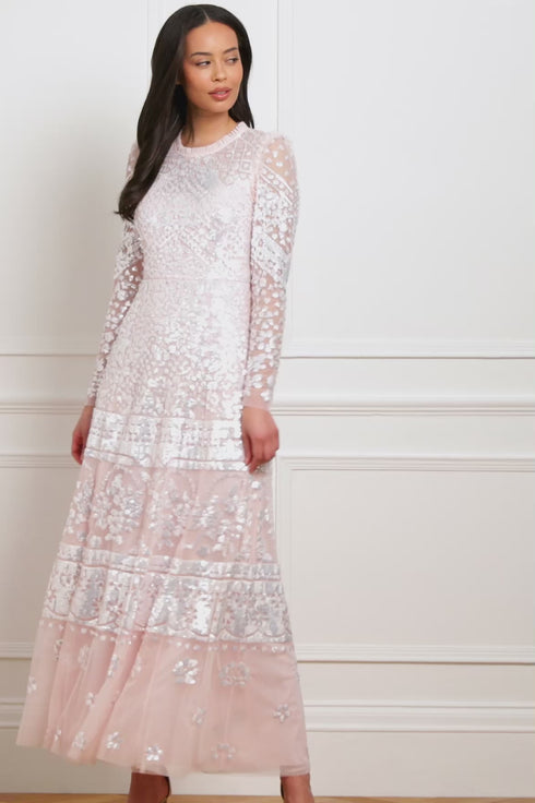 The Aurora Gown in Dusk Pink/Cream. A signature Needle & Thread style from the archive, this timeless gown draws inspiration from antique tablecloths of the early 1900s. Intricately crafted with a shimmering placement border of sequins, it celebrates the art of vintage craftsmanship. The elegant silhouette features a round neckline, slim long sleeves, and delicate tulle frills at the neckline and armholes—a hallmark of the brand. Finished with layers of soft, romantic tulle, this heritage piece captures classic beauty with a modern edge.