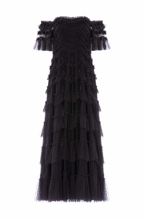 NEW SEASON. The Aviana Off-Shoulder Gown in Graphite. Modern and moody, this gown is an elevated eveningwear piece designed to mesmerise. Graduated tulle scallops cascade across the silhouette, balancing volume with lightness and the graphite tone offers a cool, contemporary twist on femininity.