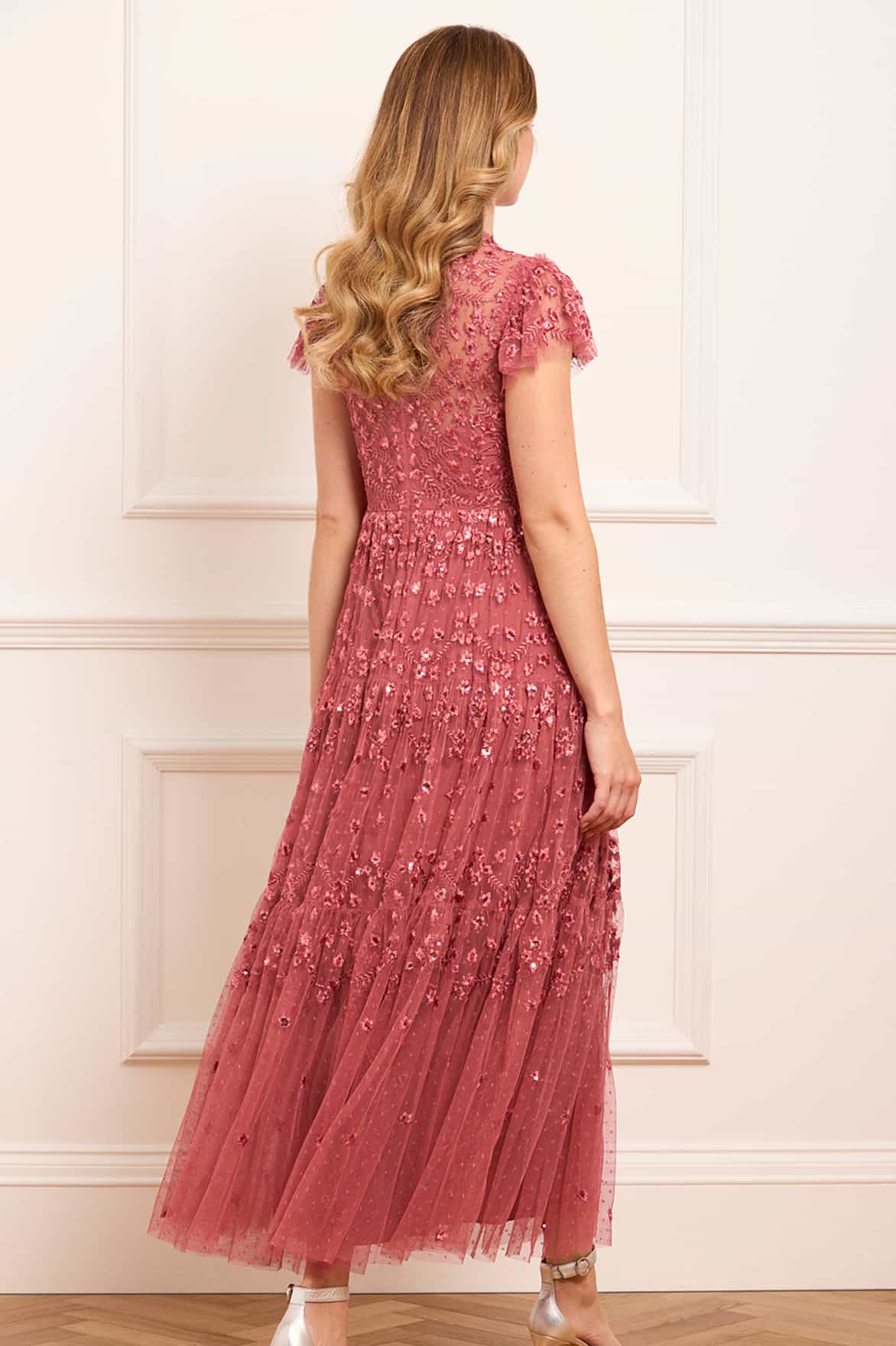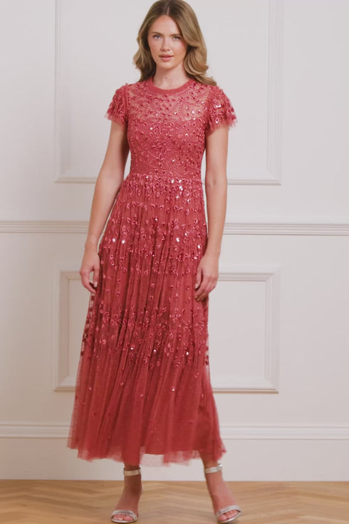 The Clover Short Sleeve Ankle Gown in Dark Rose. A timeless style from the Needle & Thread archive. Richly embroidered with ditsy florals and scalloped foliage, the design flows into a soft, ankle-length skirt with scattered floral motifs. The short sleeves and gently fitted bodice offer a flattering silhouette.