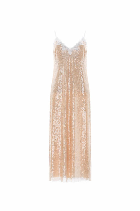 The Coco Cami Ballerina Dress in Butterscotch. A shimmering statement piece, crafted in a delicate camisole silhouette. Made from a specially developed sequin fabric, it features tiny, light-catching sequins intricately stitched onto a stretch mesh base for a radiant, all-over sparkle. The neckline and slender straps are edged with elegant lace trims, adding a soft, romantic finish. A dazzling yet refined choice—perfect for making an impression at any special occasion.