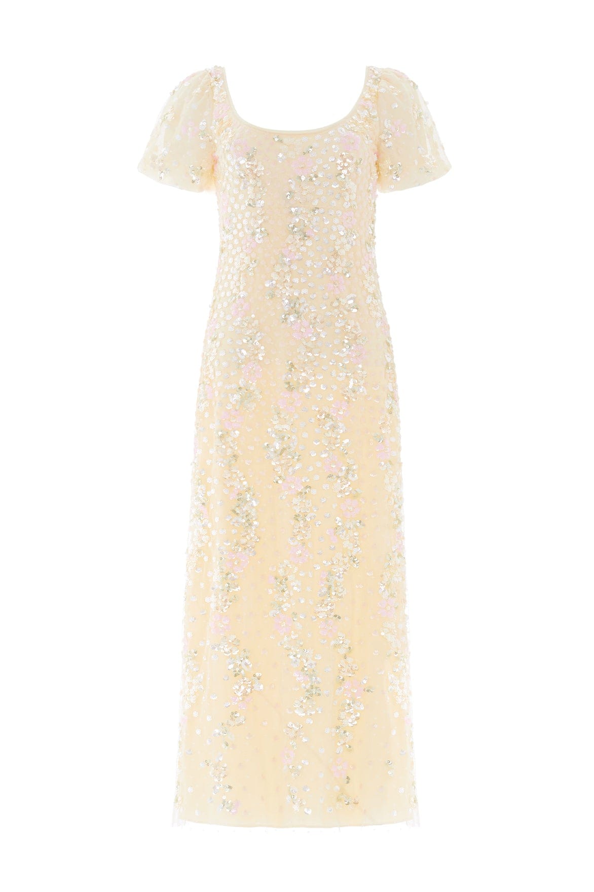 NEW SEASON. The Confetti Puff Sleeve Ankle Gown in Lemon Sorbet/Multi. Adorned with soft floral sequin motifs that scatter delicately down the dress, this gown captures a romantic, confetti-like effect. Designed with puff sleeves and a slim silhouette, it offers a refined yet softly shimmering finish.