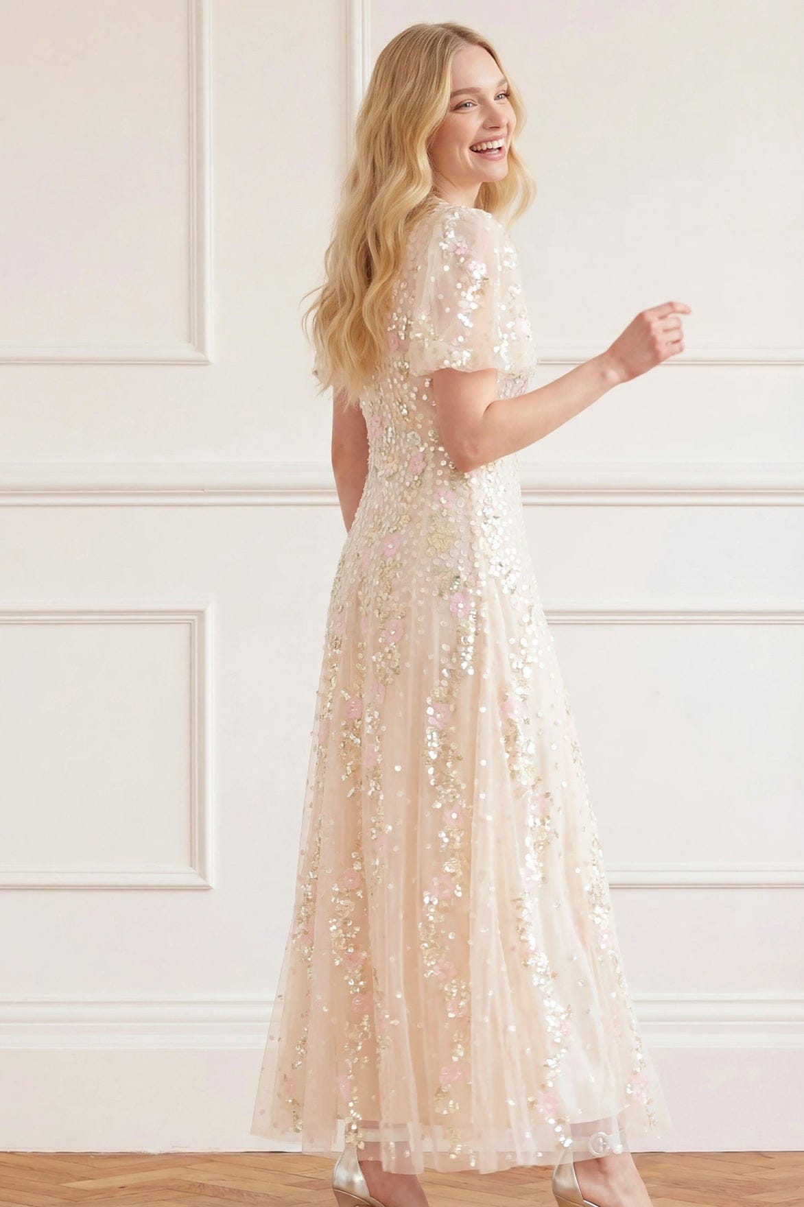 NEW SEASON. The Confetti Round Neck Ankle Gown in Cream/Multi. Beautifully embellished with scattered floral sequins inspired by falling petals, this gown creates a romantic, light-catching finish. The round neckline and flowing ankle-length silhouette offer timeless elegance for occasion dressing.