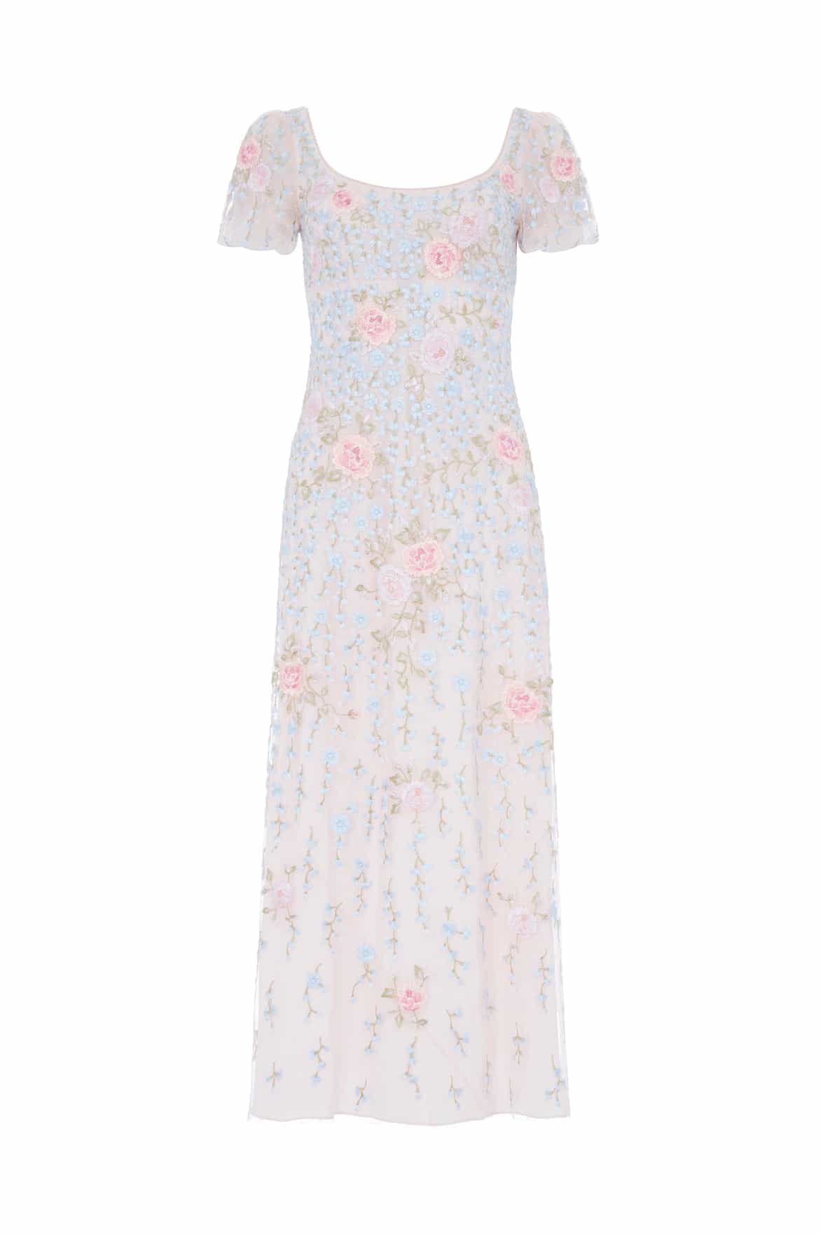 NEW SEASON. The Cressida Embroidery Puff Sleeve Ankle Gown in Seashell/Multi. Showcases exquisite peony embroidery cascading towards the hem. Featuring gently gathered puff sleeves and a flowing tulle skirt, this gown exudes romance and grace from every angle.