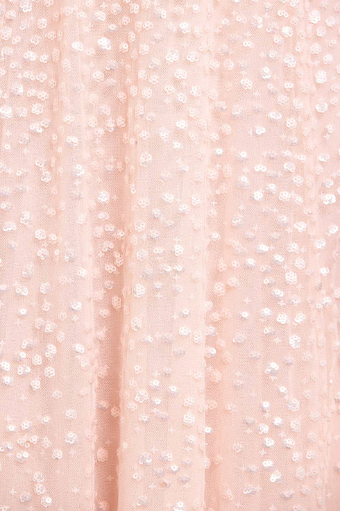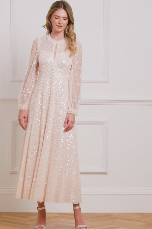 The Dappled Sequin Long Sleeve Ankle Gown in Opal. This look offers a soft and feminine take on evening sparkle. Tiny sequins are meticulously placed across the tulle fabric, fading towards the hem to create a celestial effect. The flattering long sleeves and ankle-length skirt make it a standout choice.
