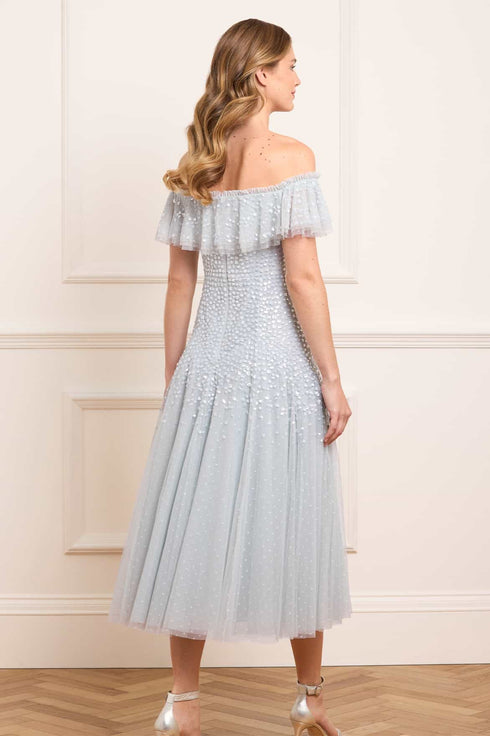 The Dappled Sequin Off-Shoulder Ballerina Dress in French Blue. This ballerina dress features shimmering clustered dot motifs that cascade towards the hem for a radiant effect. Its off-shoulder neckline is adorned with layered circle-cut frills, finished with signature Needle & Thread detailing. The dress is designed with flattering chevron seaming across the hips and a voluminous skirt crafted from layers of net and tulle, creating a dramatic, sweeping hemline. This dress is destined for truly unforgettable moments.
