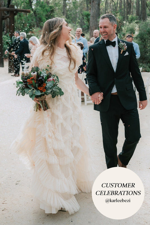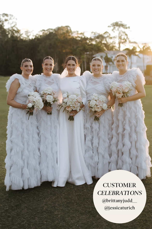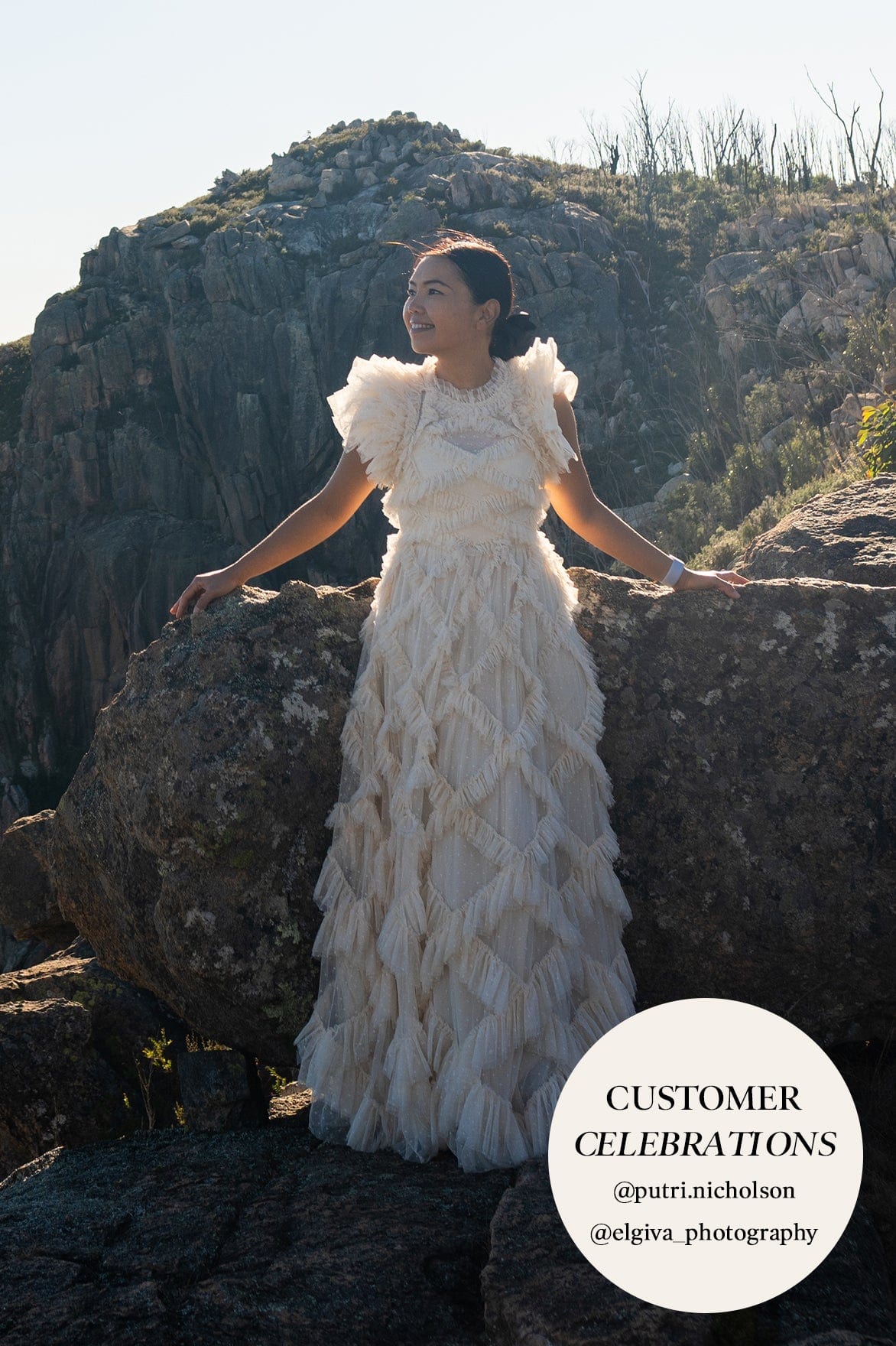 The Genevieve Rose Gown in Champagne. This statement gown is inspired by 1930s Hollywood glamour. Beautifully designed with diamond tulle details and trims. Crafted with multiple layers of ruffled, frothy tulle sculpted for dramatic effect. Make the ultimate style statement this season.