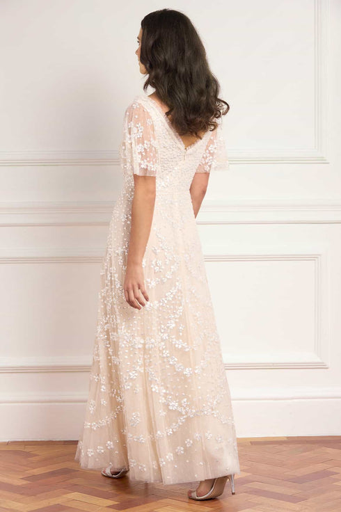 NEW SEASON. The Isobel Sequin Ankle Gown in Cream. Inspired by vintage lace designs, this ankle-length gown features delicate floral sequin motifs arranged in soft scalloped formations. The embellishment gradually becomes lighter towards the hem for a romantic, flattering finish.