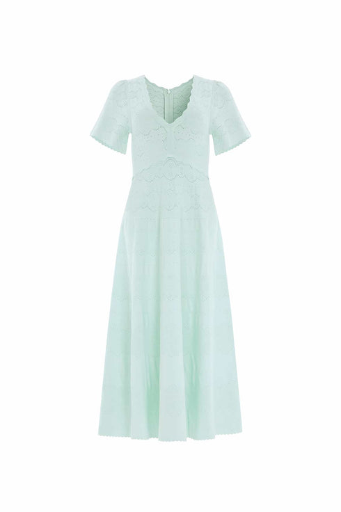 NEW SEASON. The Lace Knit Gown in Menthol Green. This knitted gown is developed from recycled viscose blend, with stretch yarn for a beautiful, flattering texture. Decorated with stitch pointelle details inspired by vintage woven lace ribbons. Crafted with a fitted stretch bodice, a feminine V-neckline and scalloped trim details for a romantic look. This easy-to-wear piece is the perfect wardrobe staple.