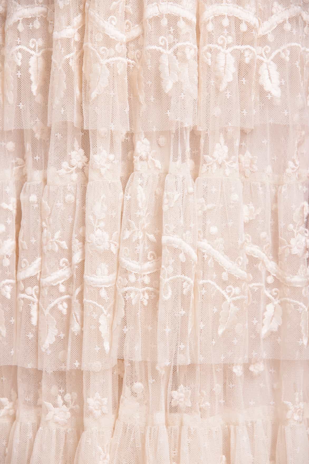 The Layered Lace Ankle Gown in Cream. This Needle & Thread heritage style features exquisite vintage lace-inspired embroidery with floral motifs and trailing leaf and ribbon designs. The flattering wrap front bodice is accented with signature tulle ruffles, while the puff sleeves with elasticated cuffs add a delicate touch. A tiered skirt, crafted from layers of soft tulle, completes the design, offering a romantic and elegant silhouette.