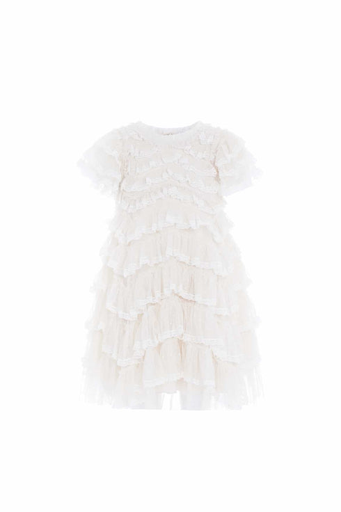 The Libby Lace KIDS Dress in Cream. This statement dress has been designed with gently gathered tulle frills in soft zig-zag borders and delicate lace trims. Beautifully crafted with layers of signature tulle, creating a frothy, elegant style. Let your little one take centre stage in this magical piece.