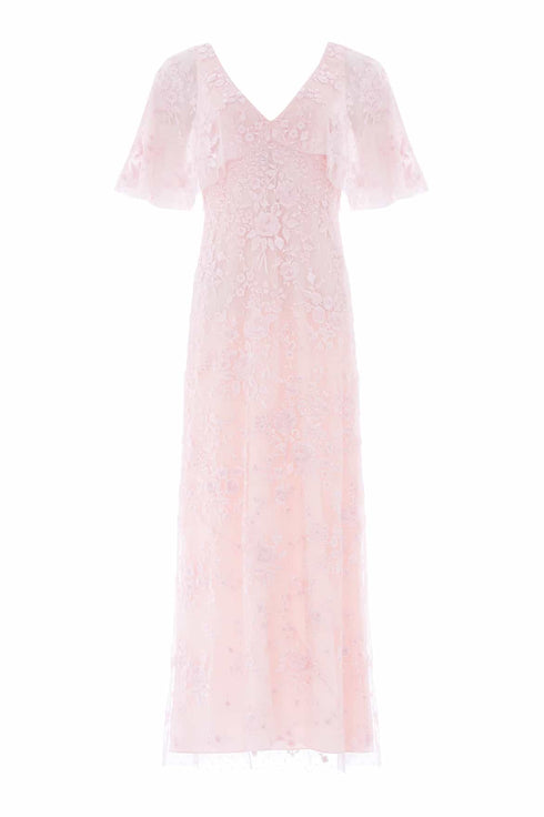 NEW SEASON. The Rosa V-Neck Cape Gown in Peony Pink. Adorned with delicate floral embroidery inspired by early 1900s artwork, this gown offers a refined, romantic silhouette. Finished with an integrated cape and a slim fit, enhanced by a bias-cut lining for fluid movement.