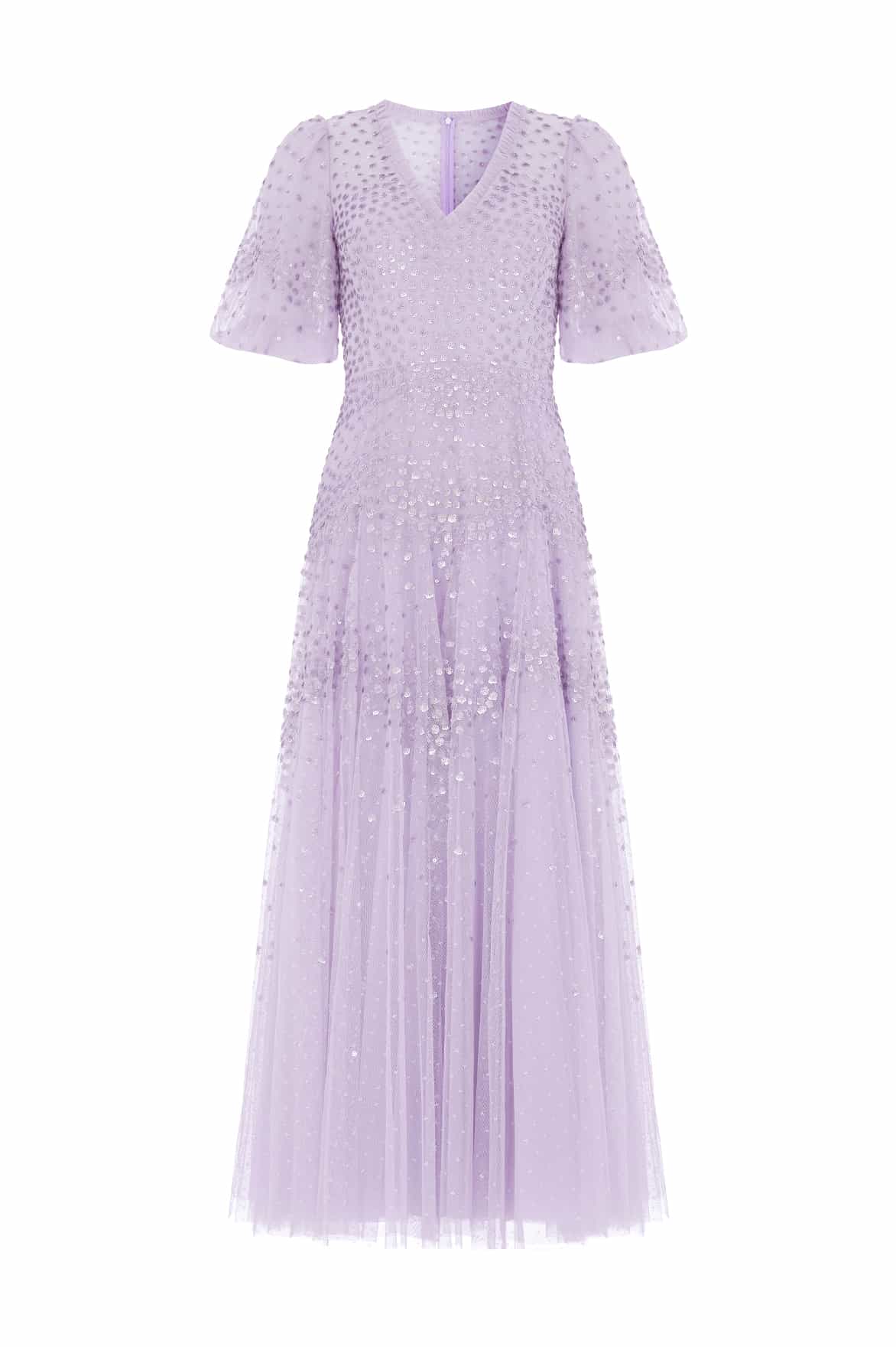 NEW SEASON. The Scallop Sequin V-Neck Ankle Gown in Lavender. Features luminous sequins cascading across soft tulle. Designed with a flattering V-neckline and flowing silhouette, this gown radiates understated elegance.