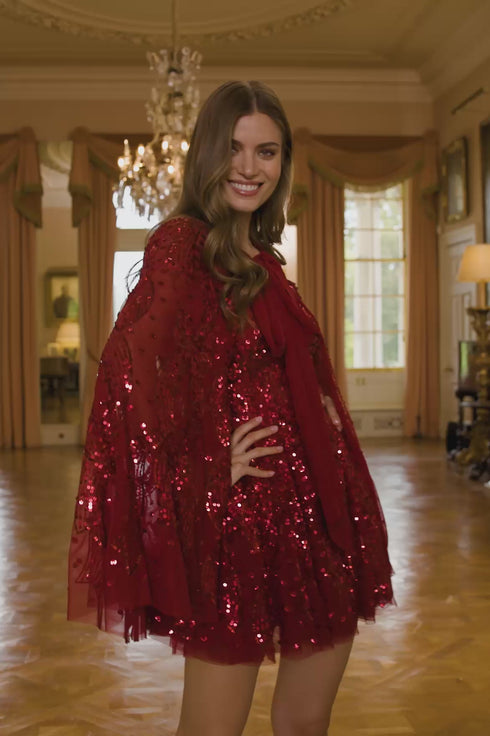 NEW SEASON. The Sequin Ribbon Hooded Cape in Red. A bold reinterpretation of celestial outerwear. Embroidered with ribbon sequin motifs, the flowing silhouette shimmers with fiery energy. The hood adds drama and romance, while the red palette amplifies its striking effect. A show-stopping piece for festive evenings.