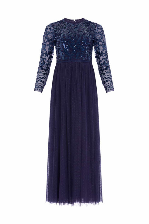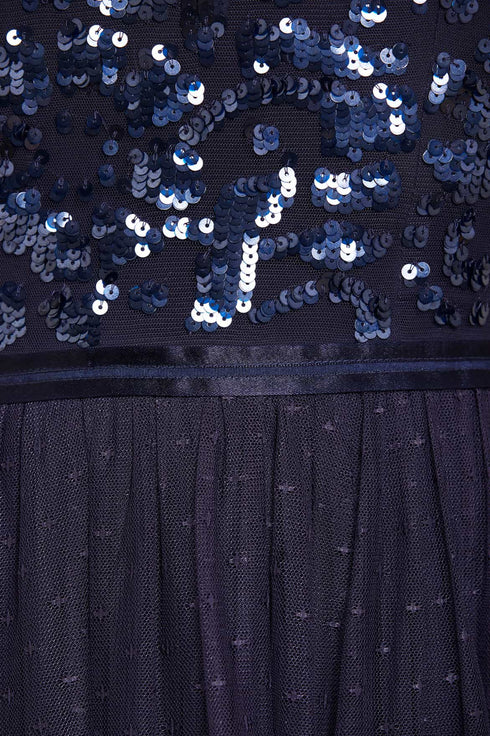 NEEDLE & THREAD EXCLUSIVE. The Tempest Bodice Ankle Gown in Navy. This ankle dress is inspired by a vintage lace tablecloth design, embellished with shimmering sequins all over the bodice. Designed with long sleeves, a layered tulle skirt with an 'x' motif and frill trim detailing around the neck. Make an entrance in the Tempest.