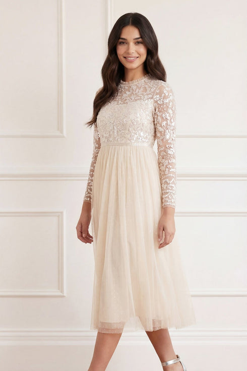 NEEDLE & THREAD EXCLUSIVE. The Tempest Bodice Ballerina Dress in Champagne / Pink. This beautiful ballerina dress is inspired by a vintage lace tablecloth design, embellished with shimmering pink sequins all over the bodice. Designed with long sleeves, a kisses tulle multi-layered skirt, and frill trim detailing around the neck. Make an entrance in the Tempest.